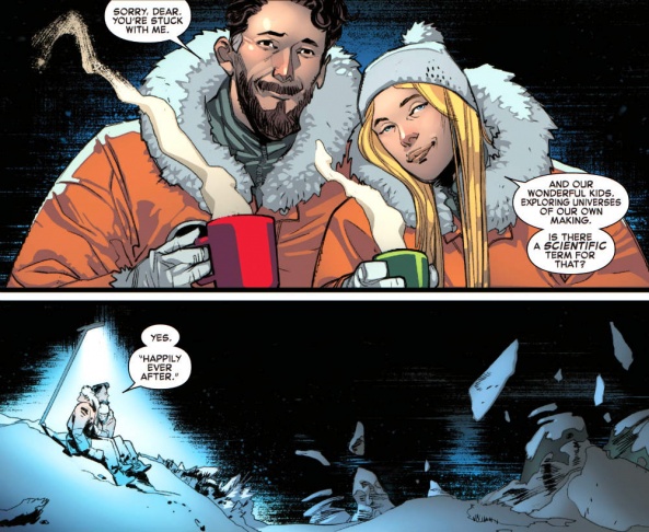 It’s not fully explained whether the multiverse is completely restored at the end of “Secret Wars,” and if Franklin’s new universes are just fun additions, or if his method of making up universes on the spot (this one is an aquatic universe, this one has helium-filled whales, etc) is the multiverse. Either way, we join them on their journey for a little while, discovering that Reed and Sue think of their life now as their “happily ever after.” Which is sweet, if not a little ‘foreshadowy’ in the same way that a photo of a police officer’s family is, just before he gets fatally shot (“he was two days away from retirement!”)