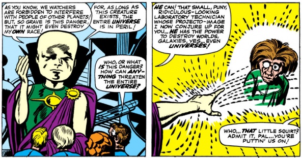 It’s worth noting that the common understanding of Molecule Man is that he got steadily more powerful as the years went by, playing prominent roles in both 1985’s “Secret Wars” and its 2015 counterpart, right down to this latest issue of “Fantastic Four” in fact, where he’s creating whole universes with Franklin and Reed. What’s forgotten, however, is that in his original outing, the FF are alerted to the dangers of this new threat by none other than The Watcher, who breaks his non-interference agreement (for like the hundredth time) to let the family know that this new being is a terrible threat to the universe.