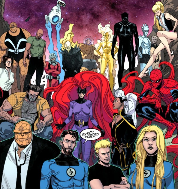 Anyone that willingly goes around calling themselves ‘Fantastic’ is due a little hubris-trim in my opinion, but nevertheless, the family of heroes goes about trying to thwart someone who is essentially a god. Reed does this by playing one of the oldest tricks in the book: appeal to the villain’s ego. “These are merely children” Reed proclaims, “you’ve not actually defeated the Fantastic Four.” Instead of just shrugging and ending them there and then anyway, Griever grants Reed the ability to summon the rest of his team so that she can defeat them fair and square. So he does just that, he assembles the Fantastic Four. Rather, he summons everyone who’s ever been a member of the FF, which at this point amounts to over 20 Marvel heroes.
