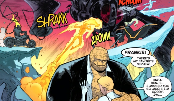 The major thing this issue gets right is nailing this reunion. Fans have been waiting for these characters to find each other again for so long that it had to be handled with the weight that it deserved. What they also get right is acknowledging the threat that the Griever poses, while simultaneously diminishing her effectiveness once the FF is truly back to being a fully functioning team. It’s not just the core members that are back together either, Ben and Johnny get to see just how big their niece and nephew have gotten (thanks to that pesky four-year time difference), and again, their reunion is touching and rewarding.