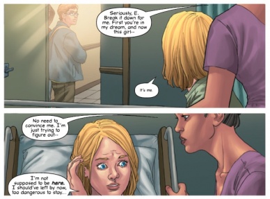 As Elle sinks back into unconsciousness, she seems to take up the conversation she had with Jo when she first woke up in Katie’s body, as though there were need to continue convincing Jo that it really is Elle who is speaking. She recalls the cast party — which I think is a reference back to the closing night of [title of show], since this was the last thing they were talking about, and when would you have a cast party if not the closing night? — and mentions that she and Dane had a fight at his place afterwards. This whole thing appears to be the incident that Elle was trying to tell Jo about last issue, but as to its significance now that she’s finally gotten it out, it’s hard to say. Was the closing night of [title of show] the night before Elle was attacked? And if it wasn’t, how is it relevant?