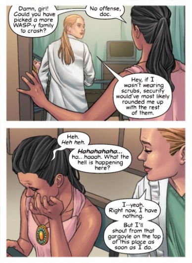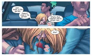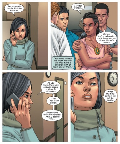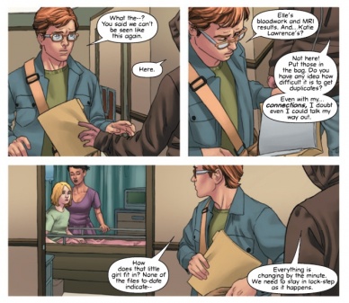 My overarching theory for the moment is, wait for it, that Elle is undergoing a transformation into a superhero. As we learned last issue, it seems something good — or at any rate, something desperately needed — will come of the Jairus Project. A superhero — some kind of human weapon — would fit that profile, provided there were a specific threat out there that required a specialized response. Aliens? Asteroids? Anyway, if the government were involved, that would certainly explain all the secrecy, and how smoothly all the cover-ups have been operating.