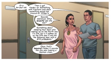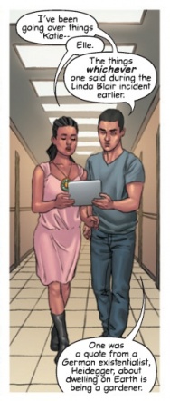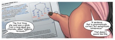From Noam Chomsky, whom Frankie describes as “a long-dead guy”. This is quite possibly the most mystifying detail in the issue, because as of this writing, Noam Chomsky is very alive. We’re left to conclude that “Mind the Gap” is taking place either somewhere in the future, or else in an alternate universe where Noam Chomsky met his end much earlier. But we haven’t gotten any hints so far that this story is taking place in the future; the iPhones all look thoroughly 2012 and so does the iPad Frankie’s holding. And while an alternate universe is possible, this would again be our first hint — other than the weird stuff happening to Elle — that Elle’s world is different from ours. A third possibility, of course, is that McCann slipped up, but in this case it seems unlikely. So, this is a big thing to keep in mind.