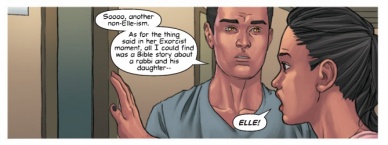 The most interesting part of this, I think, is that when Katie/Elle said this quotation in #6, Katie’s hand grabbed Dr. Geller’s — and the next page showed Min loosening Elle’s hand from her own, implying that Elle’s hand did the same thing. The being controlling Elle and Katie illustrated the Biblical moment as well as quoted it, underlining its message in an unquestionable way. Whatever it is, it’s seeking to make us understand details about the Jairus Project as well as Elle’s current state.
