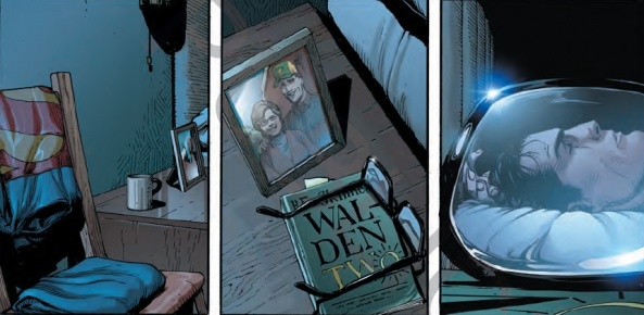 The very last pages are when we actually see anything from the DC universe. “We need to find Jon. Wherever he’s retreated to,” Veidt says and the setting changes to Metropolis. Superman is sleeping seemingly peacefully next to Lois Lane, but then we see that he is having a nightmare about the death of his parents. The book on his bedside table is B.F. Skinner’s utopian novel Walden Two. This is a very curious reading choice for Superman since the novel essentially poses the idea that humans don’t have free will, but the questions of creating a utopia “artificially” definitely fit the themes of what Adrian Veidt was trying to achieve. When does this scene take place? Surely not at the same time as the rest of the issue, since Superman was dead at that time. I wonder if we will see Dr. Manhattan aka Jon Osterman’s namesake Jon Kent during this series, since he’s a pretty integral part of Superman comics nowadays. Here the layout first returns to the nine-panel grid, then deviates it from again with the four panels per row and then returns again. This inconsistency would make more sense if the main part of the issue was entirely designed according to the nine-panel grid and the Superman part would differ from it, but such is not the case.