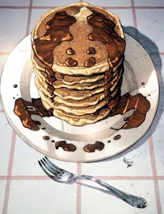 Reggie Long is getting some focus after being mostly absent for a long while. The pancakes, which were heavily featured in initial promotion of “Doomsday Clock” but have mostly been irrelevant also make an appearance. Reggie dreams of his father Dr. Malcolm Long and the death of Byron Lewis from issue four, with ‘you see what you want to see’ being repeated again. Batman needs Reggie’s help to find Veidt and prove Superman’s innocence, but Reggie refuses to cooperate.