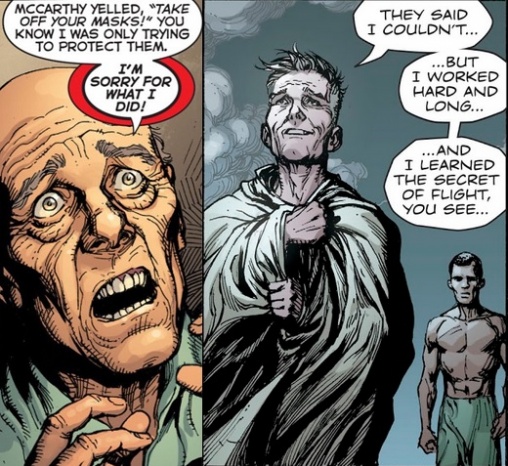 Reggie continues to think back to his youth in his cell while watching a mosquito fly into a blue-lighted bug zapper and fry itself. He apparently took psychology classes in college in his father’s footsteps. When psych class is cancelled because of protests, Reggie starts driving home. Now we see the scene of him being trapped behind a taxi from a different perspective and the light of the squid attack. Here the light is blue, whereas in “Watchmen” the scene was first coloured in a green hue, then completely white. Remembering this and the death of his parents sends Reggie into a screaming rage, which is interrupted when his new psychologist called Matthew Mason enters the cell. We go back to the flashback sequence which gets more and more disturbing as Reggie remembers his time in Fitzgerald Asylum, Maine in the “Watchmen” universe. The psychological effects on those who would survive the squid attack weren’t nearly as vital to Adrian Veidt’s plan as the millions who died, but here it can be seen that the consequences were vast. On the roof of Fitzgerald, Reggie meets an old man who is an important character for the rest of the issue. Byron Lewis aka Mothman was one of the masked adventurers who belonged to the Minutemen. He is a quite minor character in “Watchmen,” having been hospitalized before the main events of the series. The attached documents of “Doomsday Clock” #1 included Lewis’s obituary, saying he died in a fire at Fitzgerald. Here Byron is seen escaping the asylum in a makeshift Mothman costume only to enjoy some good food and buy some stuff to smuggle in before being caught again.