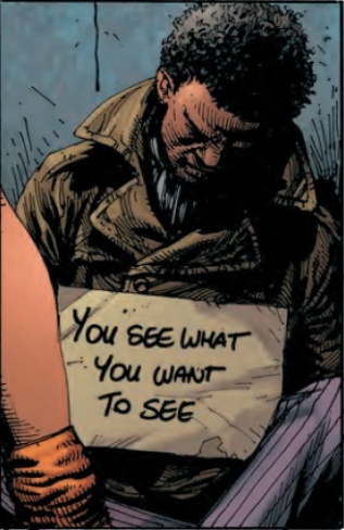Near the riots, Rorschach II aka Reggie Long is still sitting in the street, holding a “You see what you want to see” sign. This thought was presented in issue four, which was centered on Reggie’s character. Otherwise the “Watchmen” characters are still mostly absent. Mime and Marionette haven’t been seen in a while and Adrian Veidt appears only in two panels as the background manipulator pulling the strings.