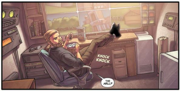 For issue #20, there is only one major scene of cameos and easter eggs, and that’s with the security guard who Lara brings Vanessa’s now dead body to. The security guard in this scene is played by Robert Wilson IV, a very talented artist who did a comic entitled “Knuckleheads,” which is also the name of the cereal he’s eating (and, as a bonus, the cereal box cover is based on the “Knuckleheads” cover and the letters in his bowl spell his name).