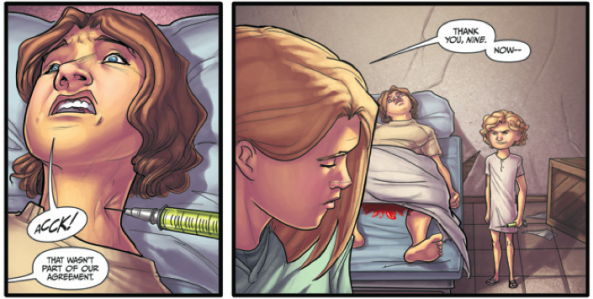 Now seems a good a time as any to remind people that, back in the MGA Study Hall podcast for issue #10, Nick Spencer revealed that Nurse Nine is just a lady, and her name isn’t anything special that we’re supposed to pick apart. She’s not a clone, or some weird replicant thing; she’s just a girl who grew up whose name is Nine because it sounded cool. Then again, Nick also has said in the past that he would lie through his teeth about anything and everything, so feel free to divine any additional information from this scene as you see fit.