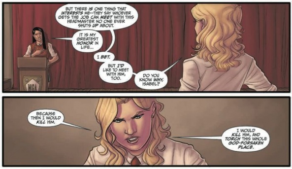 In issue #35, Daramount brutalized Fortunato in order to send a message to the student body; it was a move that I referenced by paraphrasing Elton John – “the bitch is back.” Now we see that this worked, as Daramount struts through the halls of the Academy with all the confidence of the queen bee (I referenced Lorde earlier, and I’d imagine Daramount is a fan of the chorus to “Royals”). Students don’t even want to make eye contact with her anymore. It’s almost heartbreaking; you were beginning to think that Daramount really cared about the students after the “PE” arc, hugging the students as they returned, and now all she wants is their fear.