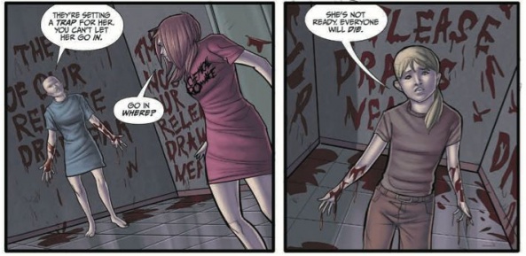 And, last but not least and we’ll certainly talk about this whole scene more in general later, but it’s worth noting that the end scene of Casey getting ready to announce her candidacy for student body president also mirrors the final scene from issue #3, in which it appears that Casey might be compliant with the school’s insanity to keep up appearances — something that, for all intents and purposes, is echoed here rather adamantly.