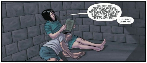 Akiko is seen here reading ‘Royal Monsters’, the 11th issue of the first volume (contained, for the record, in the second overall trade of the series if you want to go get it) to the blinded Fortunato. It’s a touching little segment, re-iterating Akiko’s tragic state of affairs as a somewhat ghost/guardian angel to Fortunato, whose own situation is fairly tragic as well, and it shows that Ian’s actions did not go unnoticed. It’s interesting to see that in addition to Fortunato, Akiko sees herself as Ian’s guardian too, or perhaps his moral compass, and that without him she feels partially responsible for him going off the rails — all of which is just rather sad, in my opinion.
