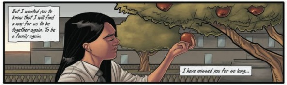 Now the apples are back, and stand out to me more than the heartwarming letter from Vanessa’s mother to her. We see Vanessa approach a tree and pluck an apple from it, which sends my theorizing mind wild.