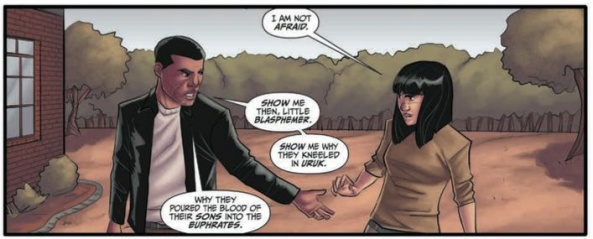 Back in issue #30, we first met Mr. N., Irina’s new private professor with the name he claims is difficult to pronounce. We didn’t have too much to go on at the time, but with this issue Mr. N. seems to break a little bit as he makes mention of Uruk and blood in the Euphrates river. For those unaware, Uruk was an ancient city of Sumer (then Babylonia) that was along the east bed of the Euphrates River, and is most famous for being under the rule of the legendary Gilgamesh. However, fans of the book should have had a lightbulb pop over the head at the mention of Babylon, if only because of Issue #22.