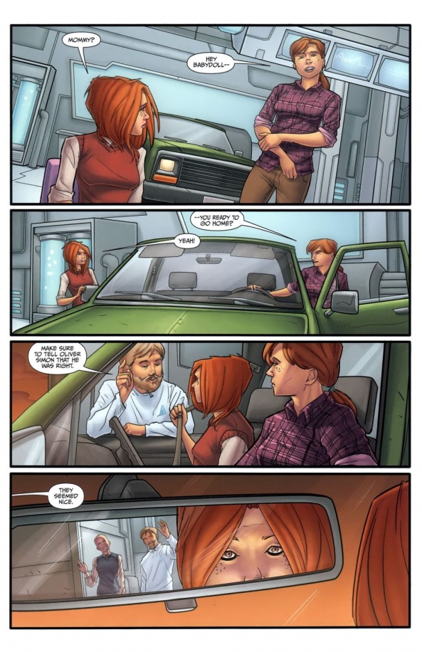 Of course, as reality gets manipulated, it has a visceral reaction on Casey, causing her to pass out. This is similar to what we saw back in #29, when Casey interacted with the Cylinder to fix the broken reality that Irina had caused, and similarly passed out. In that instance, it seemed to be a moment of timelines colliding or converging in order for reality to be “reset”; here, however, Casey is taking no direct physical action with the Cylinder — she’s simply the object of what it is being used to manipulate around.