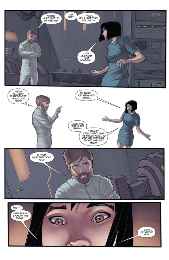 As the issue opens, we’re given a brief glimpse of a mysterious beach, with a hand grabbing into the sand. One key thing to take away here is that this is the triumphant return of the first-person perspective; a frequent device that was utilized a lot in the beginning of the series, its usage has died down a bit. Now it’s back in the penultimate issue of the season, and its importance is fairly big — especially given a line from Dagney that will be spoken later in the issue (about eyes being opened — you know the one). But keep in mind that the use of POV was done in order to show us things not quite normal, or out of sync with what we could potentially define as reality in the book. While the reasoning behind its use here seems pretty blunt, it’s worth noting the importance of bringing back this device in general.