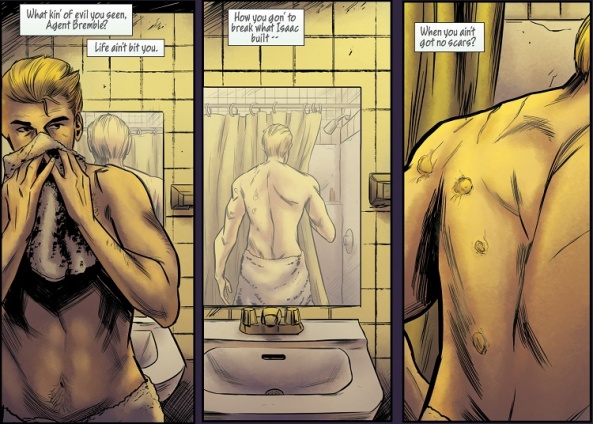 Agent Bremble brings his own historical context to the series, his experience in my generations quagmires in Afghanistan and Iraq. Which gives the series a bit of a generational rhyming quality. His experiences in Afghanistan have given him an intense since of self-loathing and appreciation of the Law. Mr. Pross sneers at Bremble for being to clean cut, judging by his outward appearance, to take down Isaac or Eden. Appearances deceive in “Postal” which we see again when Bremble cleans up and reveals his scars to the reader. This moment of revelation is an inverse of the motif, normally we are shown people putting on the mask and becoming someone here it is all stripped with a shower, shave, and six panel gird.