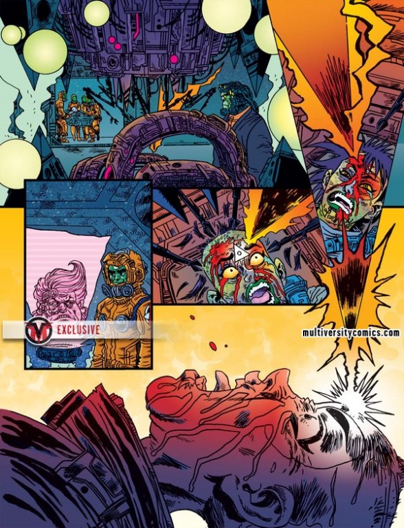 Most sci fi these days is very Ridley Scott noir, dark and colourless (which, I do love), but it is so overdone. So I thought let’s make sci fi mental again, and Dom stepped up in a hue way. His work was the perfect collaborative team for me.