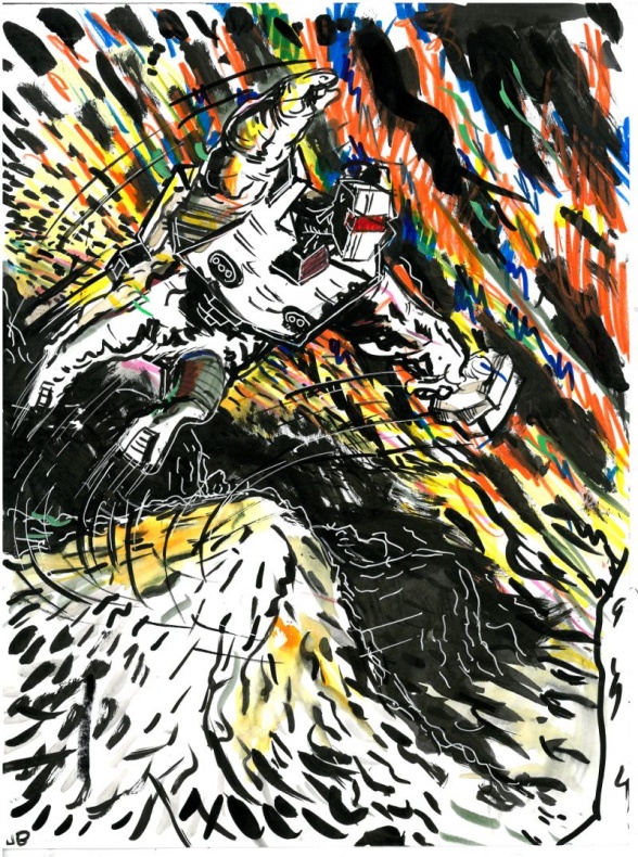 Josh didn’t just do one piece, but a triptych of Rom pieces, all of which will be auctioned off to benefit Bill Mantlo later this summer. Stay tuned for auction information!
