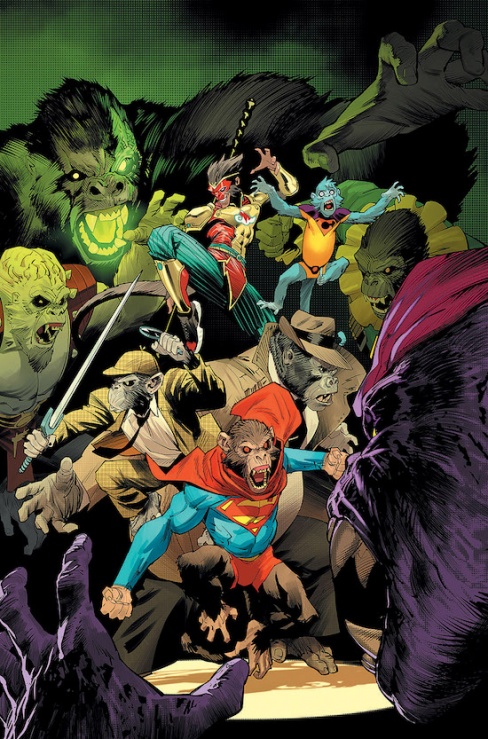 Please be ape-vised.Gorilla Grodd’s recent incarcer-ape-tion in the pages of The Flash has left a void that Monsieur Mallah is more than happy to fill. Ape-sembling a group of the DCU’s most sinister simians, Mallah forms the Legion of D(oo-oo-ah-ah)m, with an eye toward world domin-ape-tion. But the world won’t be conquered that easily! Enter the all-ape JUNGLE L(ee-ee)gue. Can this team of hero-eek anthropoids be the salv-ape-tion we need, or will Mallah’s team of maniacal monkeys bring forth the ape-pocalypse?