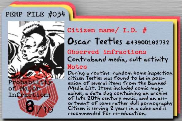 ATTN: ALL CITIZENS OF THE MEG! Be aware that there is always a Judge watching you. Each sector is equipped with millions of HD-CCTV and bioID units. They are there for your protection. If your intent is upright citizenry, then you have no qualm with our surveillance. And remember: if you see something, you are now an accessory to a crime. That’s six months in an Iso-Cube, creep! Random CPU algorithms has selected this citizen for immediate surveillance and assessment…