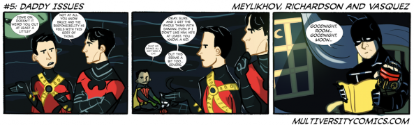 So, lets see, what happened? Oh, right: in the latest issue of the end of Morrison’s Batman Epic, “Batman Incorporated” #7, the identity of the Heretic was revealed as an adult clone of Damian Wayne engineered by Talia al Ghul. My oh my! After seeing how he dealt with Damian, how is Bruce going to deal with this revelation of another son? And one doomed to destroy Gotham?!