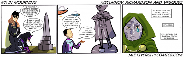 Currently, all Bat-related DC titles are tied into this ‘Requiem’ thing, where everyone has to share how they felt about the now deceased Damian Wayne. It would be great, if most of the characters didn’t adamantly share their negativity for him whenever he was around. After all, Damian was a bit of a jerk; it was pretty easy not to like him. He had, what, three friends besides his dad, not counting his cat and his cow? And one of them doesn’t even exist in the DCnU! But everybody is still sad that he’s gone now.