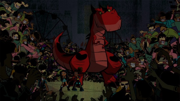 Dang: Disney Channel cartoons can get pretty grim, but what a creepy contrast to the prior shenanigans. Devil crashes the horrifying proceedings, showing up with a load of jellyfish stuck to his tail after mistakenly taking the Staten Island ferry, reminding Lu fear isn’t an emotion you need to get over, but one you need to get through. She enters the funhouse as herself to avoid revealing her secret identity, and punches the Beyonder’s recreation of the clown who scared her as a little girl right in the face. Gratified he could help Lu reach her realization, he gives up Mimi, and the three get to enjoy the rest of their day. However, when Mimi has a moment to herself, the Beyonder flippantly tells her “they” are coming for her. – Christopher Chiu-Tabet