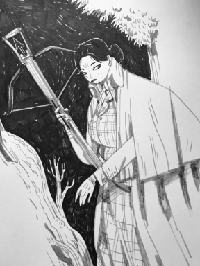Warwick: I was left to my own devices really. I would have happily received any input but also very happy to continue as I was. The only input I did get from Mike was about Van Sloan particularly. We were having a conversation of messages about something or other and I sent an image of her. He liked it and said that he felt a certainty that she should be Scottish. As it was I was hiking the Great Glen Way and standing on the shore of one Scottish loch or the other and thought that would be ideal.