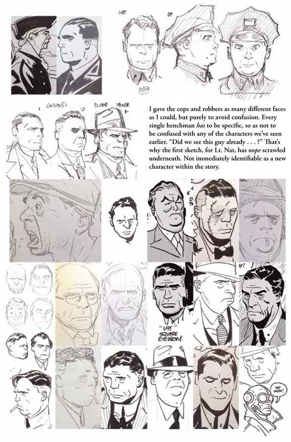 Continued belowFaces are another part where I have to make sure enough variety happens in the big shapes, since they have to work with my rather simple inks, but again, trying to keep it within certain naturalistic parameters. I could get away with a Pruneface-like character once, if all the other characters look pretty normal. I don’t want too many crazy-looking characters. Too much of it just becomes… too much. It just makes you read it in a much different way.