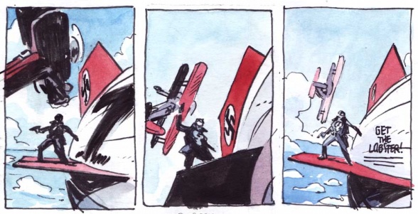 And that was my favourite page in the whole book. It’s another one of those sequences that demonstrates the point of view in Lobster Johnson stories. Readers are made to empathise with Cindy, not the armed man crouching in the window, his face hidden in shadow. Not to mention the panels on the Lobster are rotated to one side, so the reader can feel Cindy doesn’t know where she stands with him. Her point of view shots are off-balance.