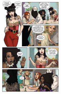 KW: I’m a gamer, but that aspect doesn’t influence the actual storytelling. I make a few jokes here and there but I tell them in such a way that even a non-gamer will still get a laugh out of them. My goal is to give that part of my own life a nod every so often but not to be bogged down in it. Right now, Rat Queens has broad appeal and I think that’s because I’m taking a more open approach to the series.
