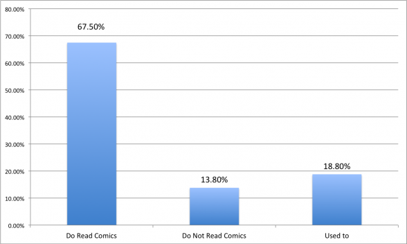 Perhaps the most surprising response of the entire survey was this chart, as nearly 70% of respondents said they do in fact read comics. Granted, comics are a widely defined medium at this point, with webcomics like The Oatmeal and XKCD vastly expanding the reach to audiences that mostly do not label themselves as comic readers. It is worth noting the likelihood that the people who were more inclined to respond were those who already had an interest in the subject, driving this number up.