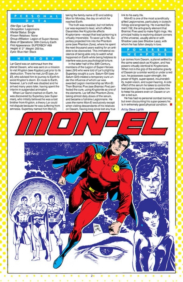 Not only that, but the pages were presented in an amazingly satisfying way. New art was often commissioned, paired with baseball card-like information and a rich and detailed written entry. You may learn more about Mon-El from his write-up than from years of reading “Legion of Super-Heroes” comics. The series had such care put into it; it truly feels like a source of pride for all involved.