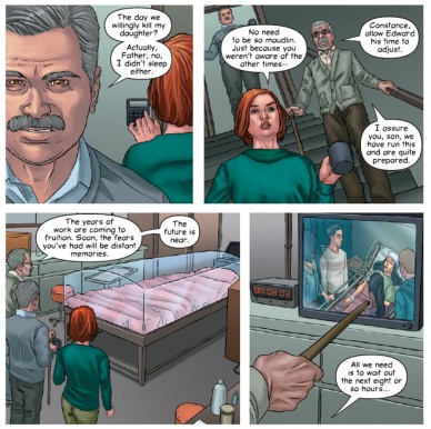 Here’s where things get a bit tricky, and the ambiguous phrasing in the captions makes me suspect that there’s a lot of story missing here. Erik clearly blames himself for Nora’s death, but it’s hard to ascertain what he could have done to himself on a genetic level that would directly – and adversely – influence the labour process. Of course, he could blaming himself in a more general sense. However, since Erik is clearly interested in Min and Edward’s attempts to have a child, the change he made in himself must have theoretically been something that he could pass on to his descendants. And if he made a genetic change in the family line that would adversely affect all his descendants, that would definitely be something to feel guilty about.