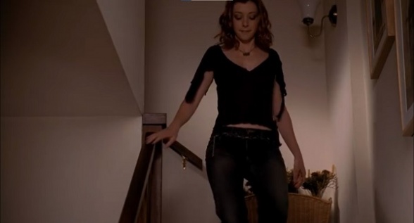 Season six is the most starkly transformative season for Willow and her clothes. In scenes where she’s taking care of Dawn, or sharing loving moments with Tara, she retains her season five style. In scenes where she uses dangerously powerful magic, to the point that it becomes like a drug, her clothes become darker. The one exception to this is the scene where she sacrifices a deer to resurrect Buffy, in which she wears a white sweater over a white lacy dress. Recall, dear reader, that Willow’s clothes reflect not who she is, but how she sees herself. She believes resurrecting Buffy is the good and moral thing to do. Her all-white ensemble shows us her delusion that she is doing the right thing, as well as her delusion that she won’t stain her pretty clothes with deer blood. She wears darker clothes when she knows she’s being reckless, and is excited to do so. After Warren murders Tara, Willow fully embraces her dark side wearing a black high collared shirt and black pants. This outfit completely lacks any sense of her old sexy, quirky personality. She is single-mindedly focused on destruction.
