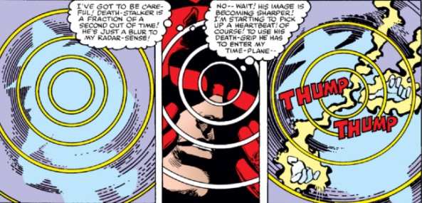 #158 is a fun enough entrypoint, Death-Stalker might not be the most Daredevil-y villain ever but I’m a big fan of the insane backstory of a time travelling cyborg using stolen AIM tech who decides the name Exterminator isn’t hardcore enough so he becomes Death-Stalker. It’s like a precursor to every 90s comic ever. He also looks a little like Alan Moore and David Lloyd’s V which is cool. The fight between them is pretty great, it’s kind of over-commentated, which comes at the art’s detriment, but Daredevil is one of the few superheroes where that level of articulation almost makes sense because he can’t see the visuals we’re seeing. Also, it might not make sense that Death-Stalker can evade Matt’s radar sense through time distortion but it’s cool anyway. #159-161 was a pretty good arc, using a whole issue to set up Bullseye as a mysterious benefactor was a really great way to keep him interesting, plus the way Daredevil beats him here reminds me of Foolkiller in “Man Without Fear” last week. It does feel like the story’s just going through the motions by #161 though, as writer Roger McKenzie doesn’t bring much new to the story. We get some great bits along the way though, like how Black Widow is a spy but she literally has her arrival into and exit from New York on the front page of the Daily Bugle, very low-profile.