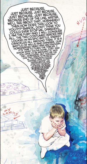 -“Timmy was born into this world just like the rest of us … and, like many of us, he has spent every conscious moment of it trying, as best he can, to tune it all out. Because just like the rest of us, no one asked Timmy what kind of environment he would like to live in. Certainly, no one told Timmy that sometimes life just isn’t fair. That sometimes people can be mean for no good reason. That people who say they love you, can treat you badly. But most importantly, no one bothered to tell Timmy that these things are not his fault.” -Ben Urich by Brian Michael Bendis (“Daredevil” vol. 2 #19)