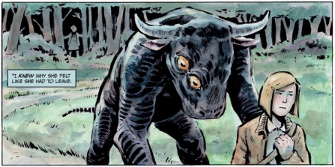 At the artistic helm of “Tales of Harrow County: Fair Folk” stands Emily Schnall, a comics newcomer who nevertheless excels at the form. Her illustration includes everything from naturalistic scenes you’d expect to find in the Museum of Natural History to cryptids and horror beasts you’d find in…we guess the Museum of Unnatural History, or something. Whatever, her art rocks.