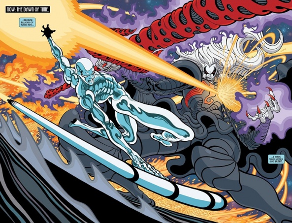 “Silver Surfer: Black” is the product of a trio of comic book superstars: Donny Cates, Tradd Moore, and Dave Stewart. Cates’s recent work has secured his place in Marvel’s pantheon of contemporary superstar writers alongside the likes of Jason Aaron and Jonathan Hickman with his inventive takes on decades-old characters. With “Silver Surfer: Black” he gives us something new again by giving us something old. More on that later. Tradd Moore is the celebrated creator of the Luther Strode series and the co-creator and artist of Aleš Kot’s sublime futuristic riff on Romeo and Juliet from Image “The New World.” Dave Stewart needs no introduction to fans of the comic book medium, but those only familiar with his muted Mignolaverse-style are in for an eye-popping high chroma treat here.