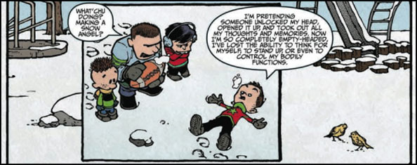 Locke & Key v4 #1 is an entirely different story, however. If for no other apparent reason than Hill and series artist Gabriel Rodriguez want to, half of the issues narrative as told through one of the central characters emulates the work of Bill Watterson. Hill and Rodriguez frequently reinvent their book, using different narrators as well as randomly changing up artistic styles in any given issue, and v4 #1 is the perfect example of the effectiveness of such an endeavor. Whenever a change in the visual narrative occurs, it always amazingly balances the story being presented, and in the case of Sparrow — that picks up some time after the shocking events of the volume three finale — it illustrates several narratives at once and allows Rodriguez to flex is illustration muscles. It is arguably one of the most perfect modern examples of storytelling only available in the sequential art form, and without completely spoiling the experience of the issue I will say this — it deserves every award.