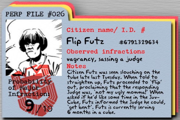 ATTN: ALL CITIZENS OF THE MEG! Be aware that there is always a Judge watching you. Each sector is equipped with millions of HD-CCTV and bioID units. They are there for your protection. If your intent is upright citizenry, then you have no qualm with our surveillance. And remember: if you see something, you are now an accessory to a crime. That’s six months in an Iso-Cube, creep! Random CPU algorithms has selected this citizen for immediate surveillance and assessment…