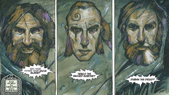 Simon Davis’s angular, abstract art fits so well with the rhythmic scripting so much more than last issue. Davis uses sparse settings to make the fight scenes feel intense and huge. Both Gododin and Slaine swing their weapons around in seemingly limitless space – a great way to use the anything goes palette that is comic books. On top of that, the sequential action is perfect – on a panel to panel level, Slaine feels so well choreographed that I can follow the way he swings around his axe with minimal effort. I should also point out how terrifying Gododin looks. Think Xenomorph, with Predator dreadlocks, and a bloody huge cleaver of a sword.