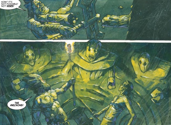 Davis has a great shot at some beautifully varied architectural splash pages. The art suffers a little from the same pacing and stakes issues as the writing does, with Slaine and Sinead only really interacting with each other. However, Davis does excel at drawing compelling human emotions during these scenes which do help drive the emotional factor of the story into the reader. It only gets more interesting from here in, however – we see the dramatic returns of Yaldabaoth’s stone army and Gododin slipping through a stone wall, almost giving a claustrophobic stress to the reader by having our protagonists so thoroughly outclassed. However, it’s the splash sections with Slaine experiencing visions from Yaldabaoth, that we get almost Lovecraftian scenes of Slaine looking on in fear at an industrial future.