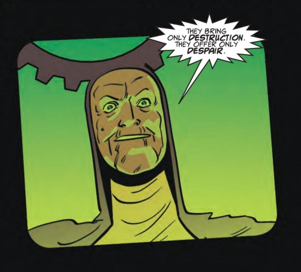 Set against coloring that exudes sickly greens and jaundiced yellows, she’s instantly distasteful. And it’s testament to just how effortless both Culbard and Edginton are in their craft that she’s made so unlikeable so quickly. ‘Engine Summer, Part 3’ culminates in a wanton act of cruelty that demonstrates just how far she’ll go to ferret out the subversives. As an exercise in building up a devilish foe for this arc, the strip is a success.