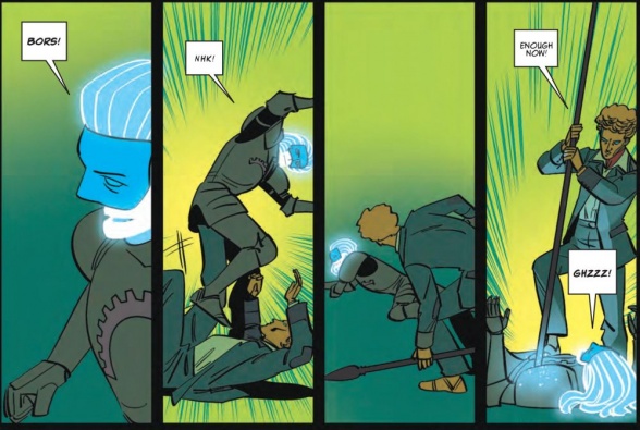Greg Lincoln: Even though ‘The Shroud’ is still coming off a bit flat and may be only serve to get us out of the Soviet story arc back to Mega City One, it does have some pretty good moments. Most of those are driven by one or more of the artistic team working in tandem with the dialogue. Paul Davidson sells a lot of the interactions between the Sov criminal Shirokov and Dredd with his command of facial expressions and his use of detailed close-ups. His panels are the reason that the antagonistic bromance between the two plays pretty well coming out of this week. Annie Parkhouse worked well with the dialogue she had and added gravity of to one of Dredd’s lines with some clever balloon placement. At least several days passed during this weeks montage of scenes and that was really driven home by the great background colors Chris Blythe brought to the strip again.