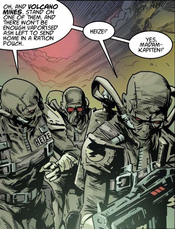 Kent Falkenberg: Where the first two installments hit the ground running, ‘In The Realm of Pyrrhus, Part 3’ begins to establish exactly what it is Kapiten Jaegir and her inglorious bastards are running towards. Gordon Rennie’s script leans a little closer to murky intrigue than the previous atmosphere of combat-boots-in-the-muck. And it’s a welcome change.