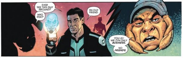 The running Luke from A New Hope gag works on a similar level, but also has the nice byproduct of Googe placing Sam and Si in the middle of the page. It’s a simple and clean representation of what the teenage emotional angst of this arc was, while all the pop cultural craziness is going on around them. The decision to have Caldwell spotlight these pages in single color pink-blue dynamic further helps to isolate them from the ruckus and makes the ruptures in their moment land better. Just as they’re about to do something honest, it gets dashed in glorious fashion. Neil Googe’s page design in these five pages is the expected efficient plainly good storytelling. His layout of the page where Inspector Qui meets his fate is a great build as the final panel slowly seeps into everything else.