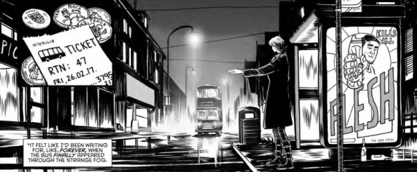 “The bus smelled like spent tabacco, or a coal fire.” Tobin narrates, ensure the atmosphere is laid on as thick as Cornwell’s inky, black lines. “There was an eerie tingling sensation when I got on, like plunging into a swimming pool filled with fur.” As the bus route delves deeper and deeper into the arcane, Cornwell’s art becomes more unsettling. The crumbling of society and mass graves are depicted outside the bus as it whirs onward to celestial vistas.